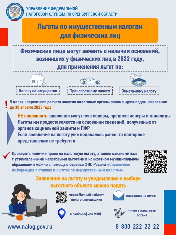 Ознакомиться с полным перечнем налоговых льгот и вычетов по всем имущественным налогам, можно с помощью сервиса ФНС России «Справочная информация о ставках и льготах по имущественным налогам» (nalog.gov.ru/rn56/service/tax/).